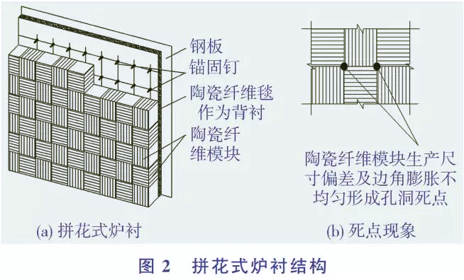 花式拼法,又叫拼花結(jié)構(gòu),是相鄰的陶瓷纖維模塊沿折疊壓縮方向成90°交錯(cuò)排列安裝。 全部安裝完剪開(kāi)捆扎帶后,陶瓷纖維模塊間通過(guò)沿不同方向膨脹回彈來(lái)填充間隙,然后成型(如圖2(a)所示)。 由于陶瓷纖維模塊生產(chǎn)尺寸誤差以及邊角存在膨脹不均的現(xiàn)象,導(dǎo)致模塊間的角點(diǎn)容易形成縫隙而成為不易處理的死點(diǎn),即我們所說(shuō)的“花心孔”(如圖2(b)所示)
